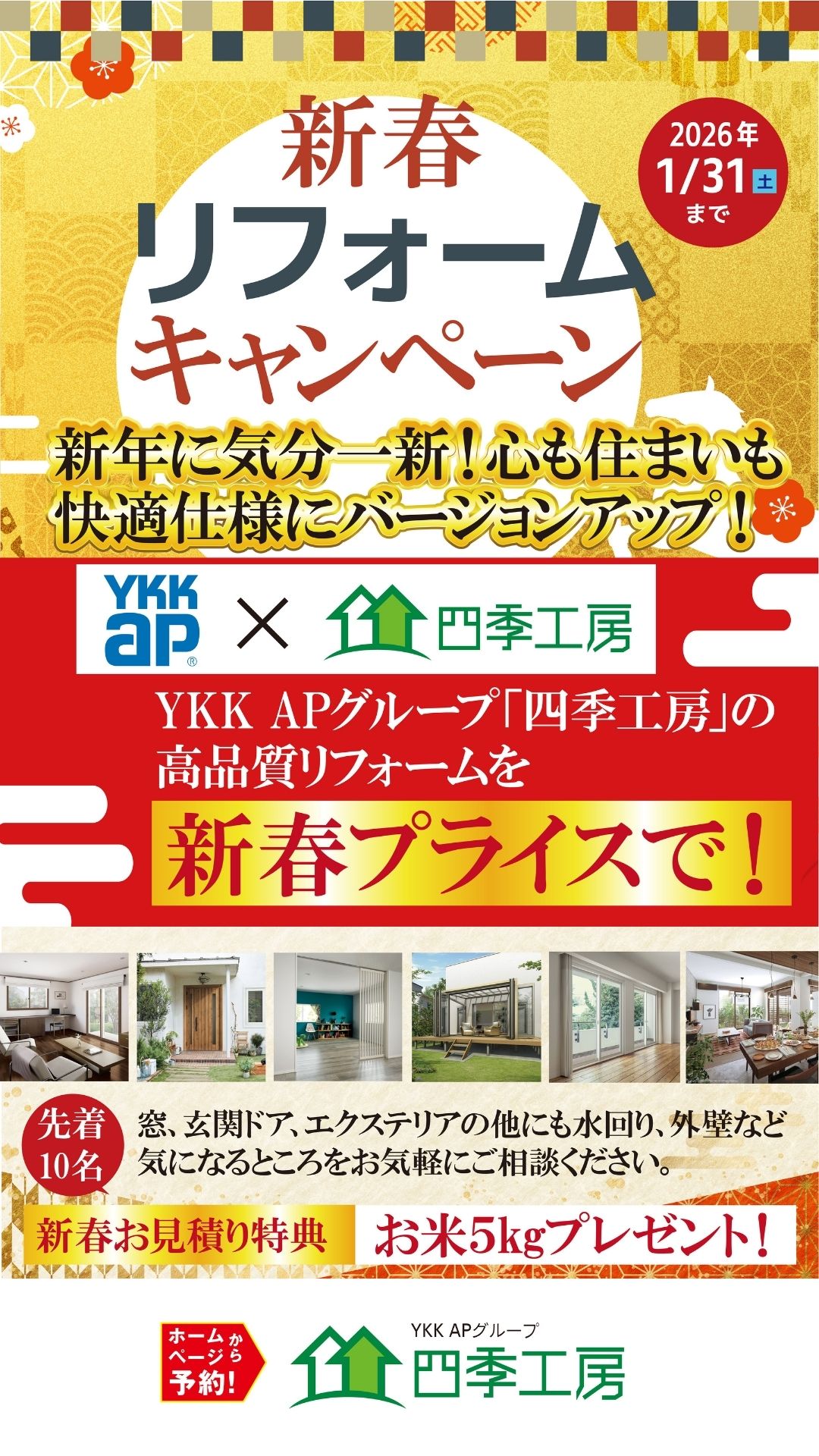 YKK APグループ 四季工房では、新年を迎え「新春リフォームキャンペーン」を実施いたします。