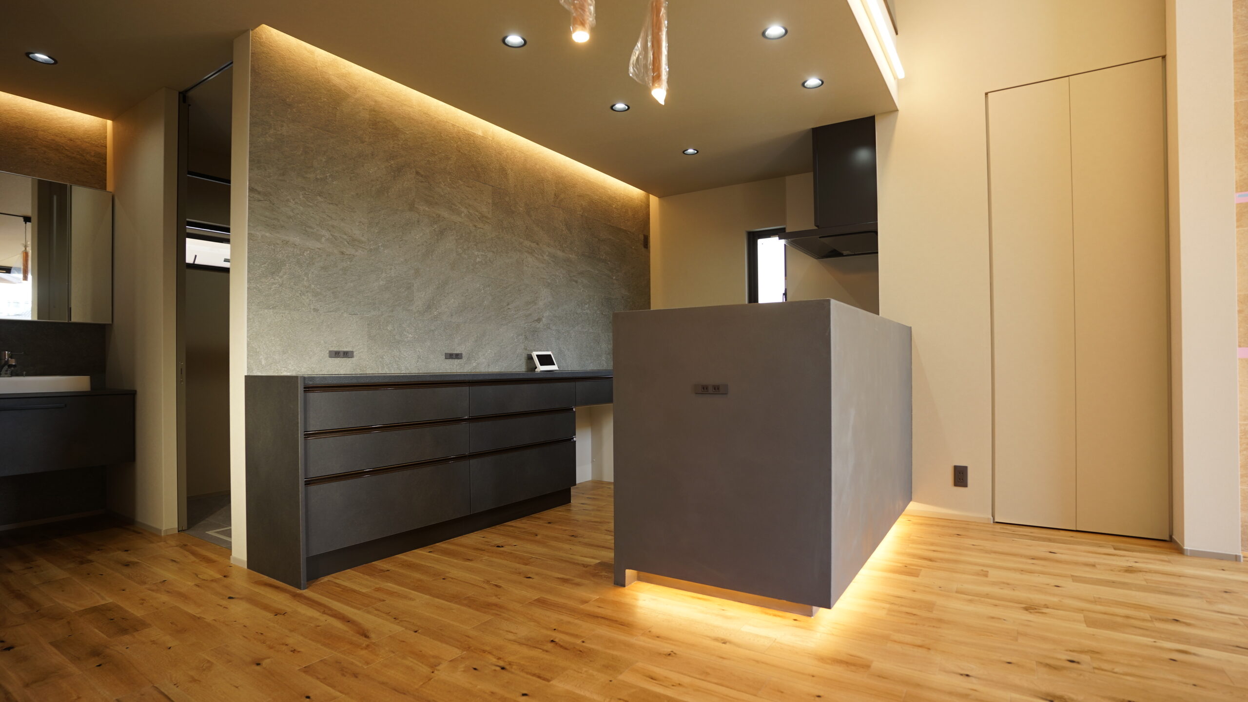 LDK、洗面、トイレといった生活空間の随所に間接照明(テープライト)をふんだんに取り入れ、